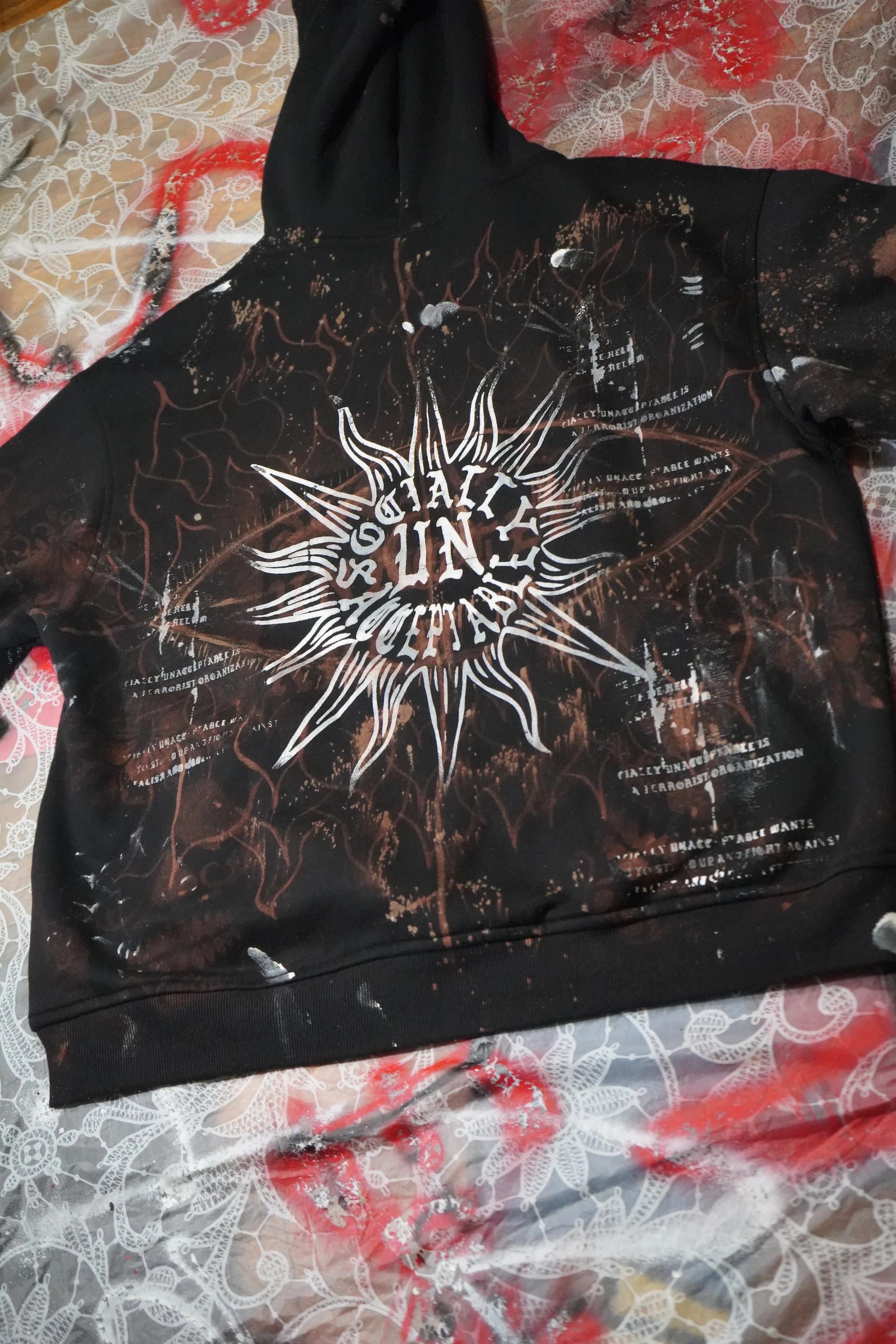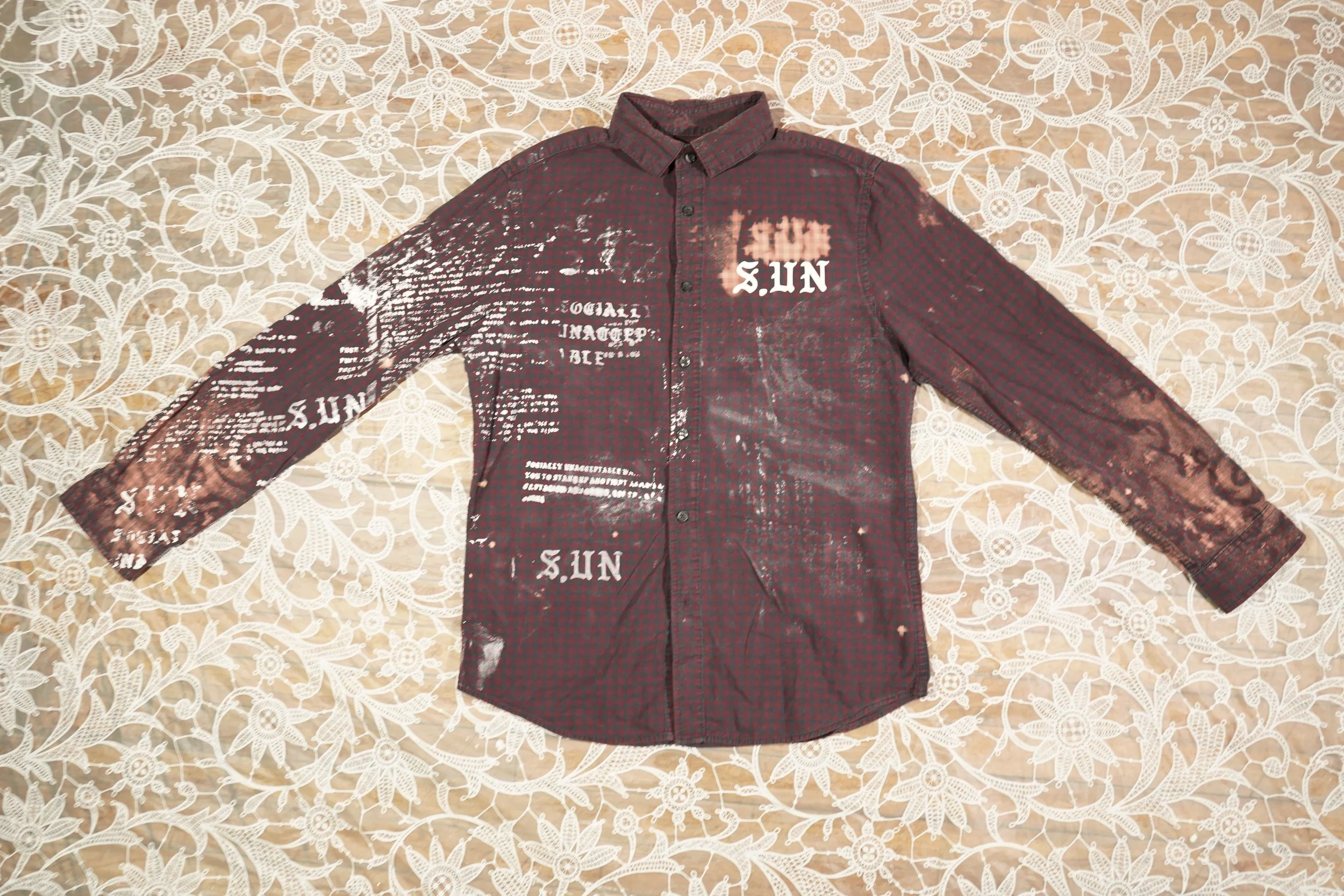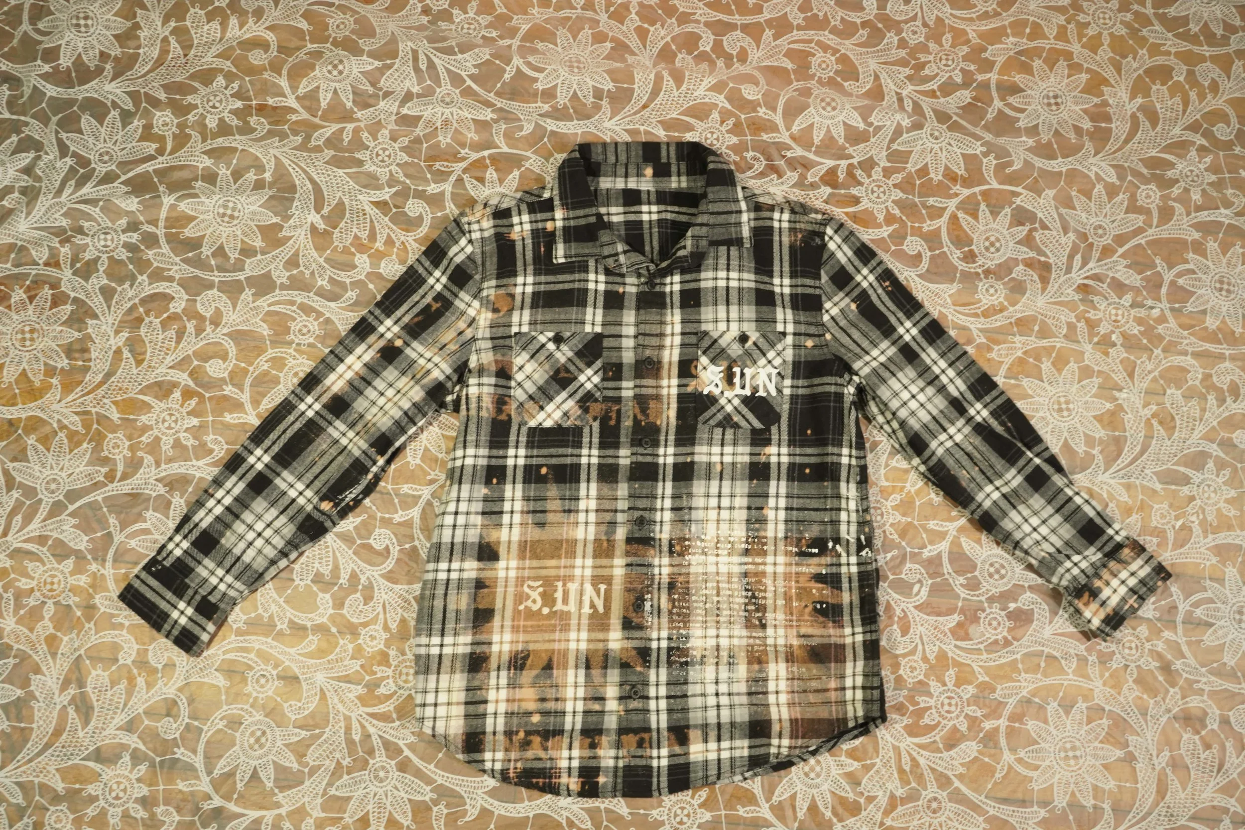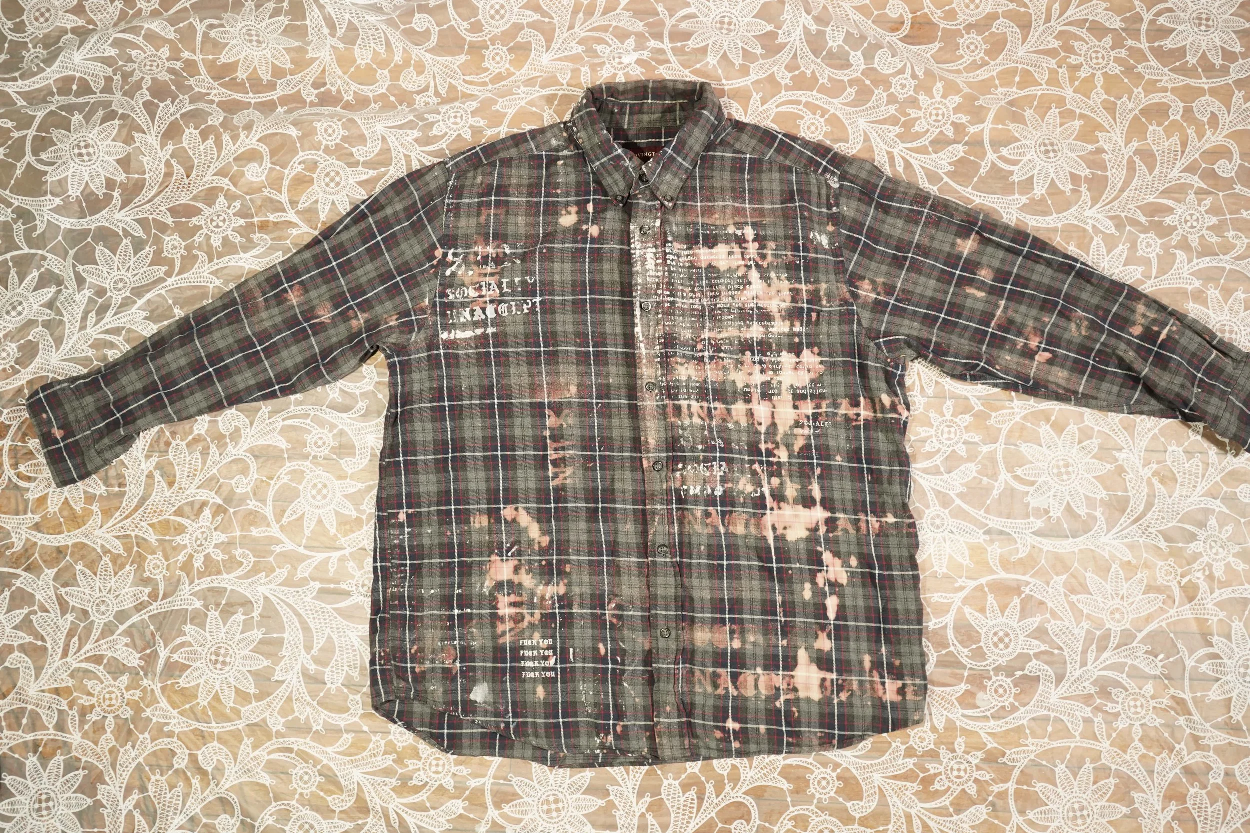 Each (RE)Printed Flannel begins with a garment that’s already lived a life. Thrifted, worn, and pulled back into circulation, it’s altered through bleach treatments and screen printing that interrupt what was already there instead of replacing it. Original patterns remain visible beneath new marks, creating tension between past use and present intervention.