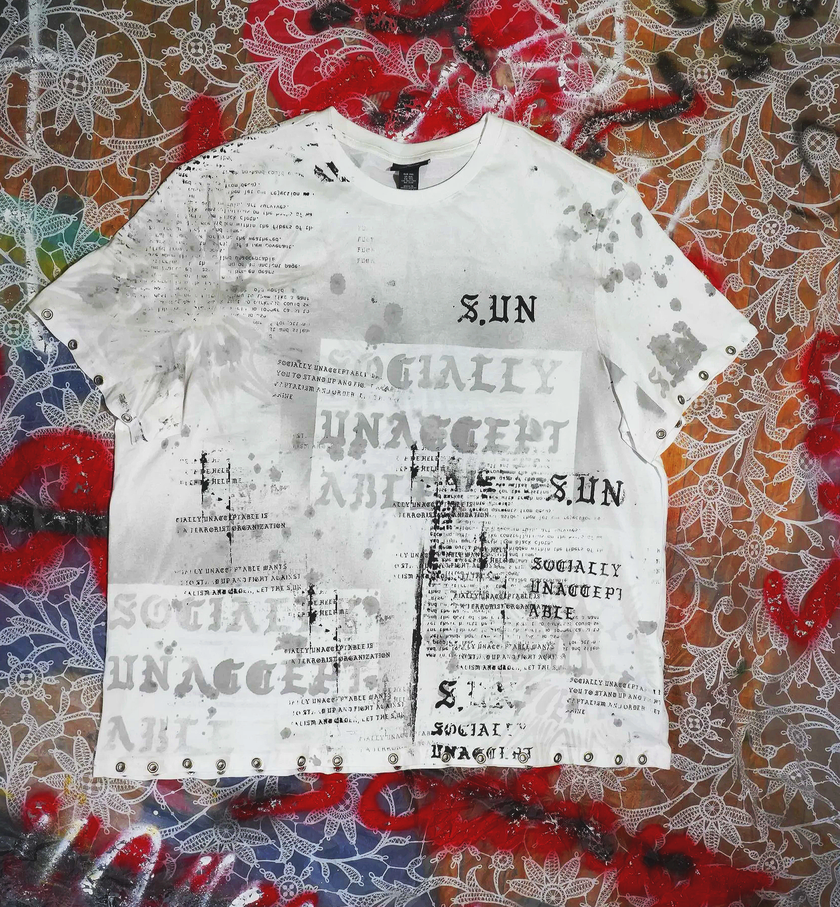 The Broken Press Shirt is pulled from the moment a print run fails—when gears jam, ink bleeds, and the headline never makes it to page. Bleach treatments eat into the fabric like chemical corrosion, breaking down the surface and exposing its past life. Screen-printed elements sit slightly off-register, intentionally imperfect, as if the press was pushed one pull too far. Metal grommets mark stress points and repairs, referencing machinery held together just long enough to finish the job.